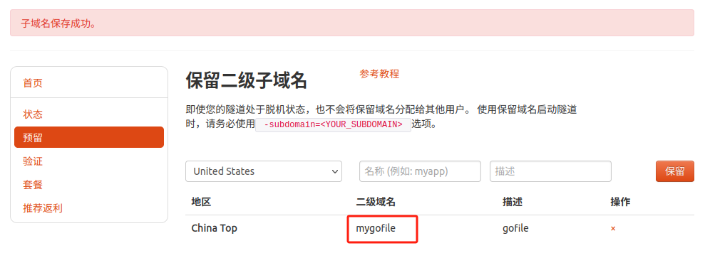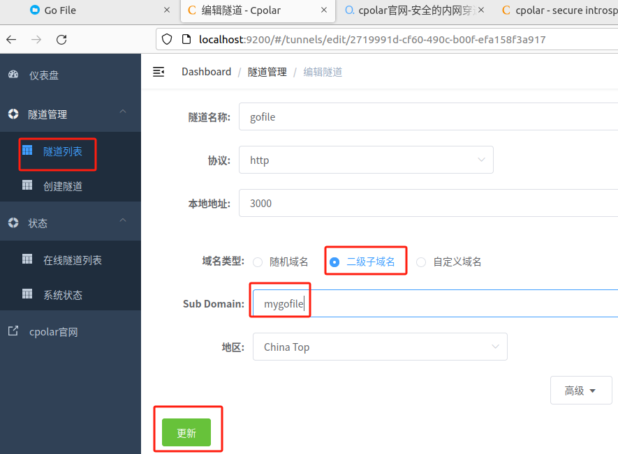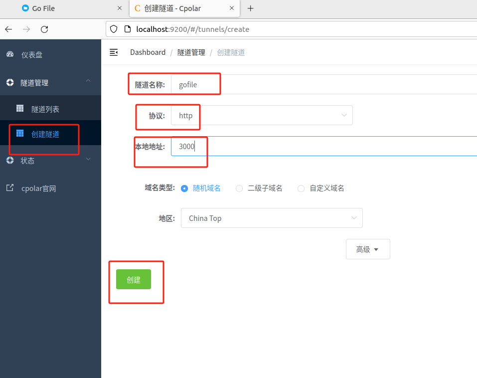 - 隧道名称:可自定义,本例使用了: gofile,注意不要与已有的隧道名称重复
