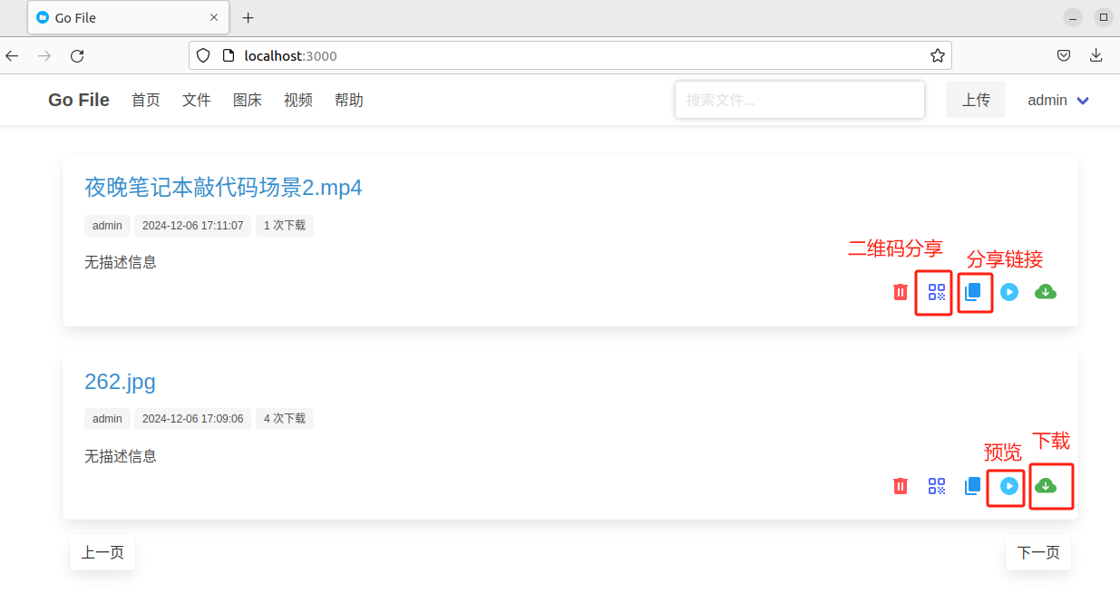 点击主页,可以看到刚才上传的文件,有链接分享和二维码分享两种方式: