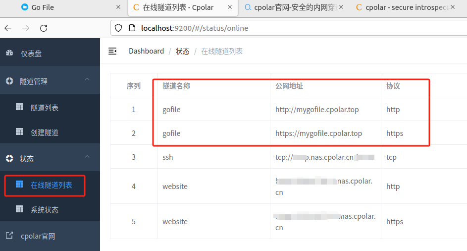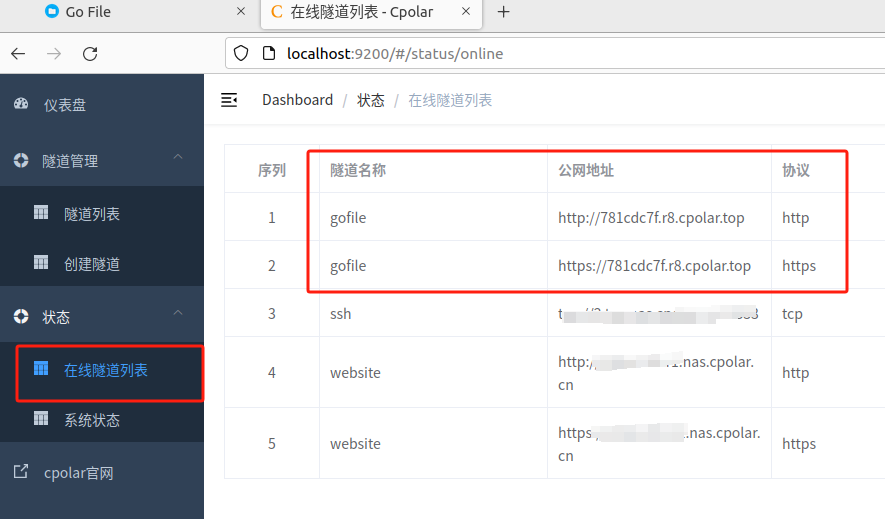 创建成功后,打开左侧在线隧道列表,可以看到刚刚通过创建隧道生成了两个公网地址,接下来就可以在其他电脑或者移动端设备(异地)上,使用任意一个地址在浏览器中访问即可。