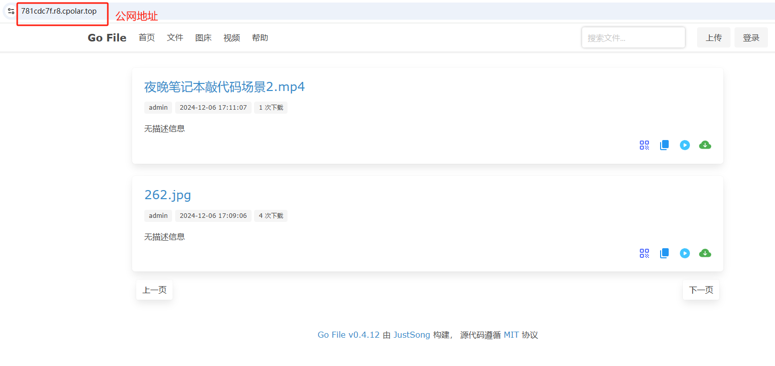 如下图所示,成功实现使用公网地址异地远程访问本地部署的Go File文件分享服务啦。