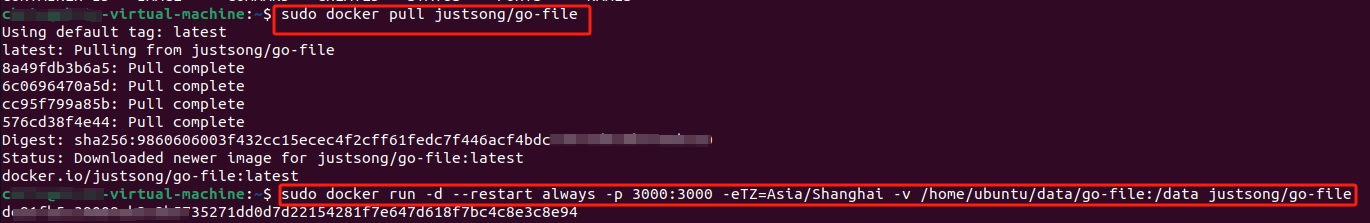 sudo docker run -d --restart always -p 3000:3000 -eTZ=Asia/Shanghai -v /home/ubuntu/data/go-file:/data justsong/go-file