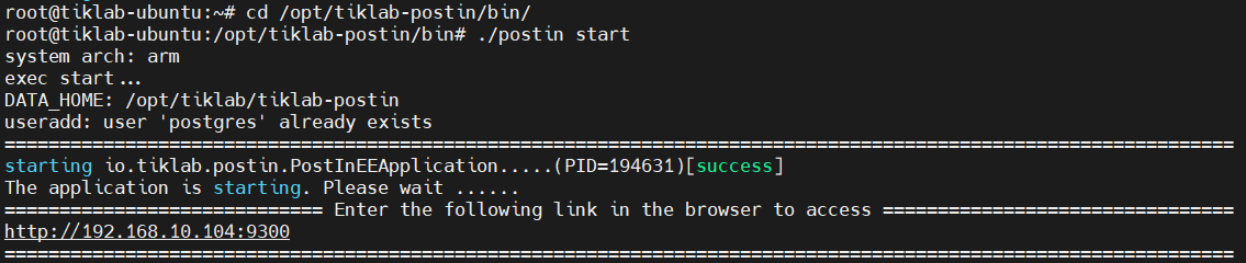 - 启动,系统默认安装路径为/opt目录,进入/opt/tiklab-postin/bin目录下,执行./postin start即可启动成功。