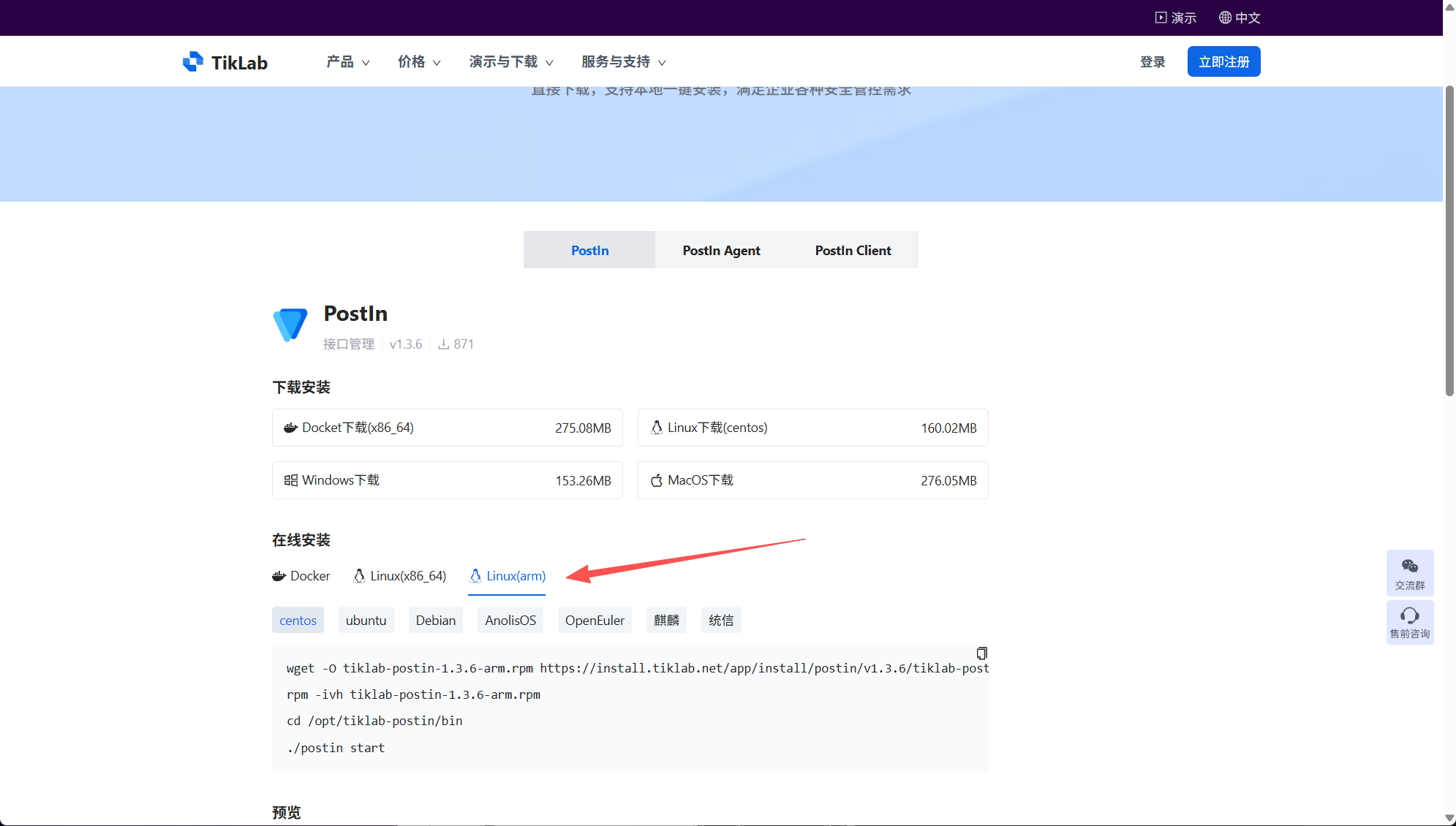 - 下载,安装包下载地址:PostIn下载,点击Ubuntu(arm)下载,下载完成后得到类似tiklab-postin-x.x.x-arm.deb的文件。