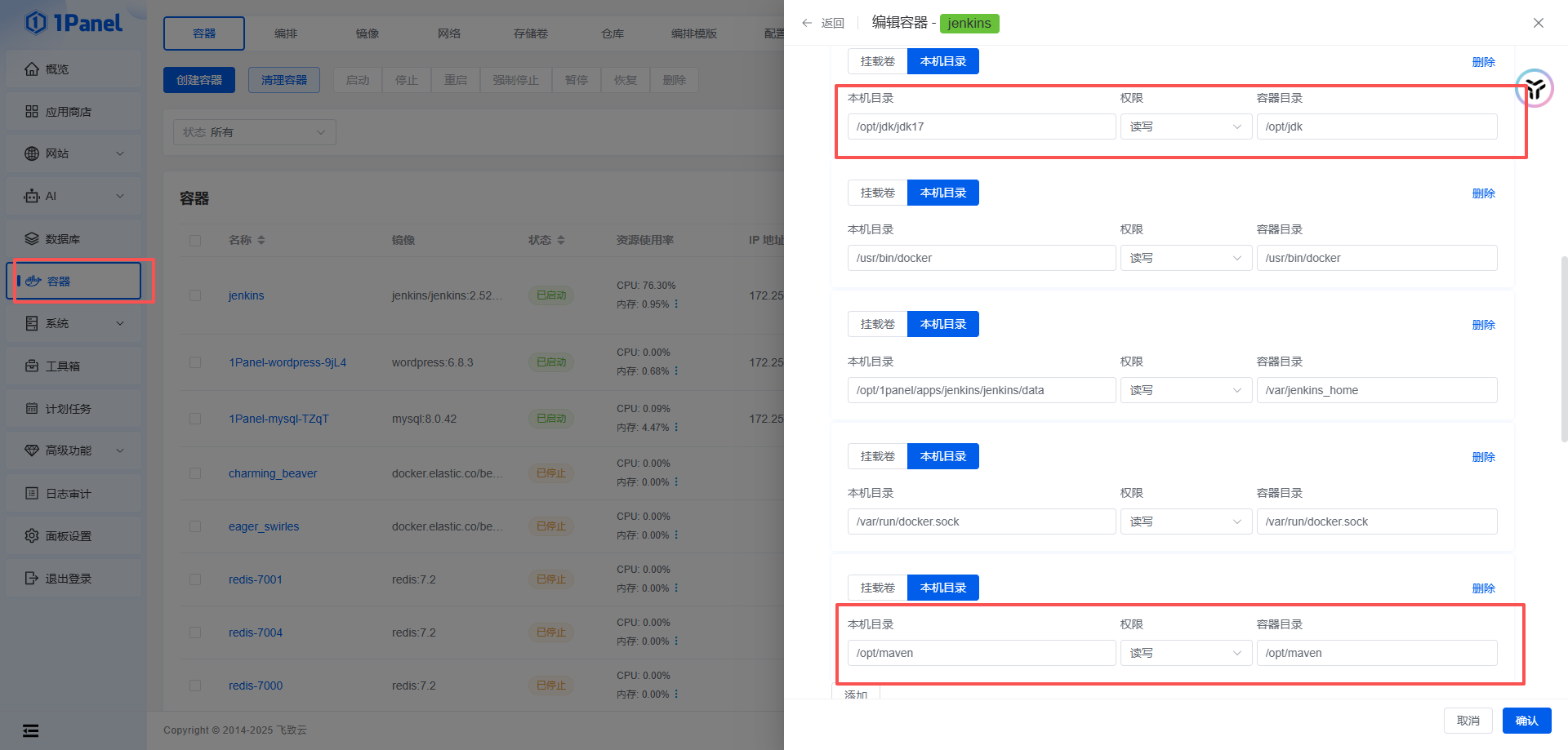 - 宿主机路径:/opt/1panel/apps/jenkins/jenkins/data