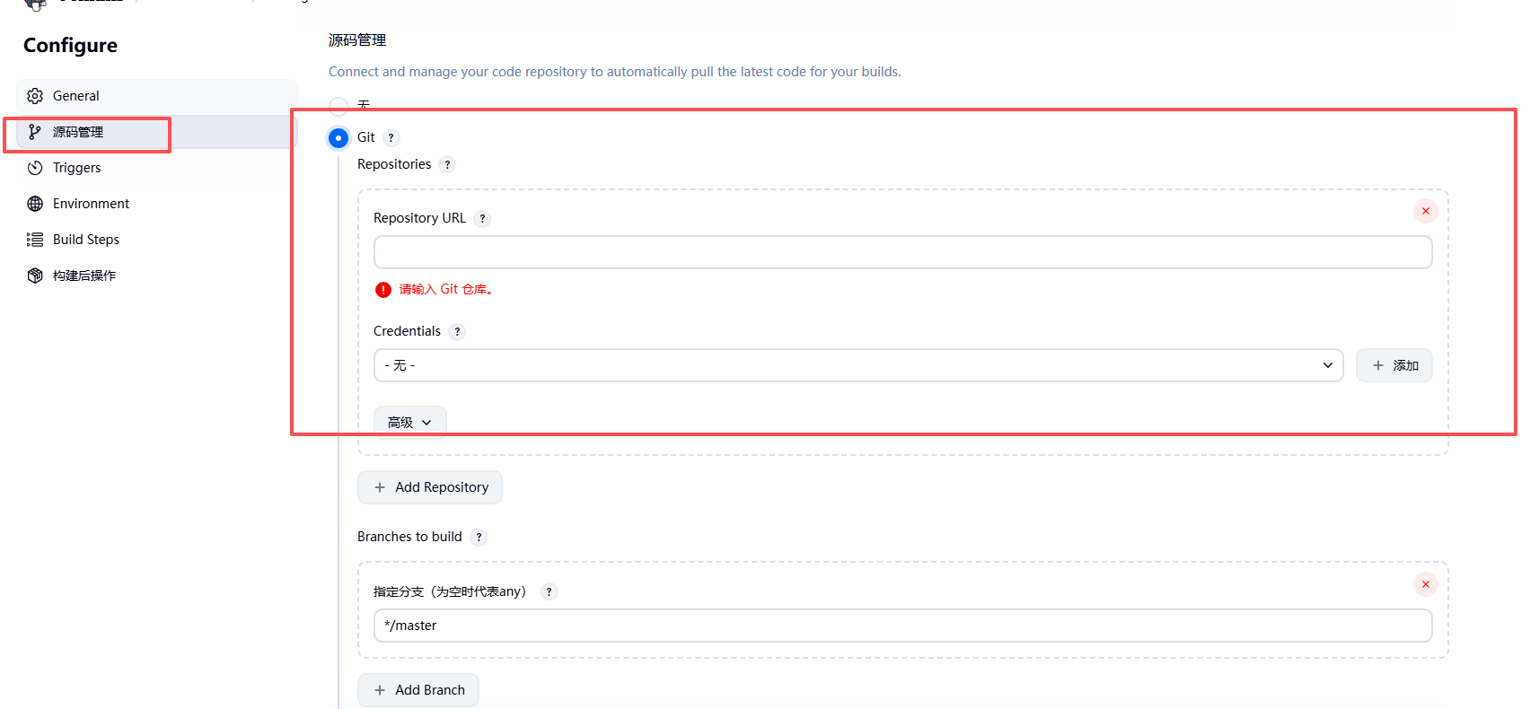 如果私有仓库,需要配置 SSH Key(Jenkins → Credentials)。