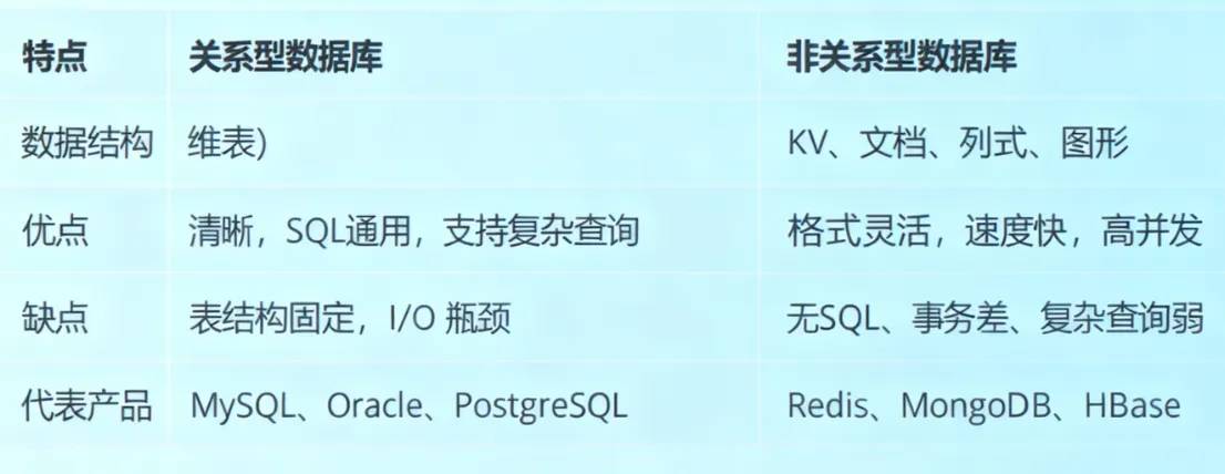 定义:Not Only SQL,存储方式不限于表,可存储键值对、文档、列式数据等。