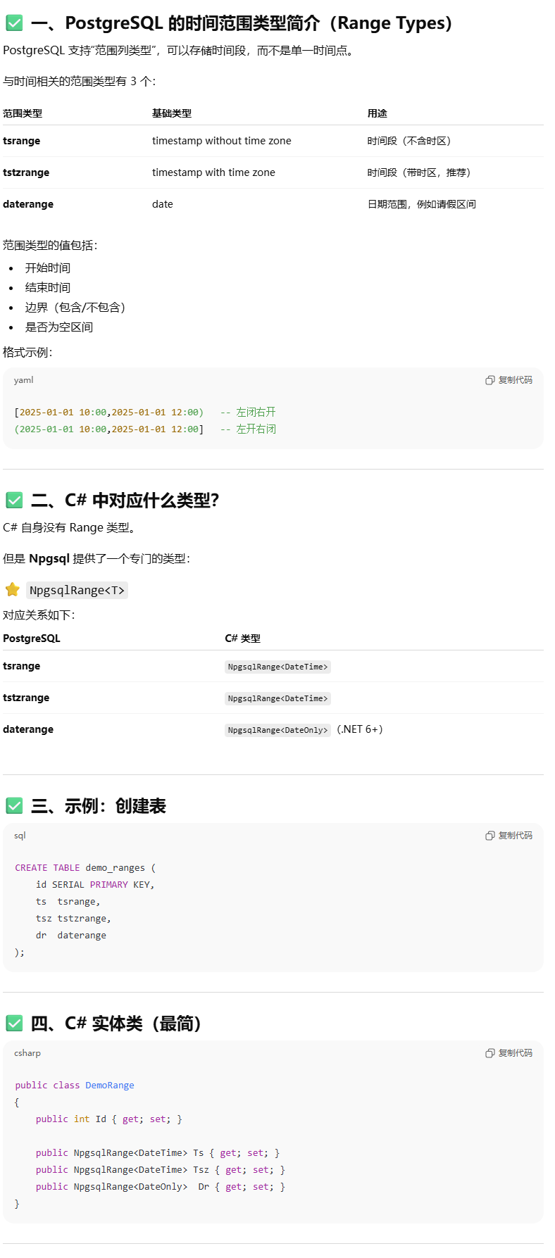 NpgsqlRange<>类型了,只需要生成sql的时候转换成对应的字符串就行了,还有的问题是?当使用 BullkCopy 时 给 npgsql 的 datatable 的 数据应该是什么?字符串还是NpgsqlRange<>?