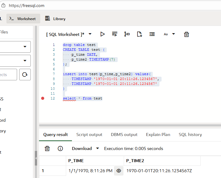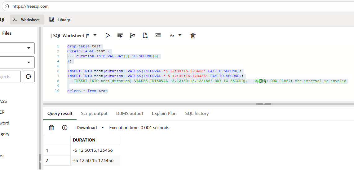 -- INSERT INTO test(duration) VALUES(INTERVAL '5.12:30:15.123456' DAY TO SECOND);-- 会报错: ORA-01867: the interval is invalid