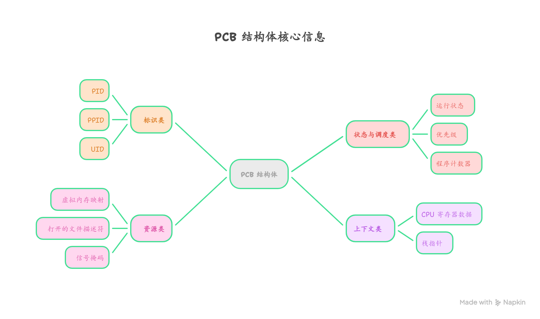 | 上下文类 | CPU 寄存器数据、栈指针 | "你的工作现场"。当进程被切换下 CPU 时,内核会把 CPU 寄存器里的临时数据(上下文)保存在这里,以便下次轮到它时能完美恢复现场,继续执行。 |