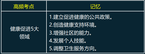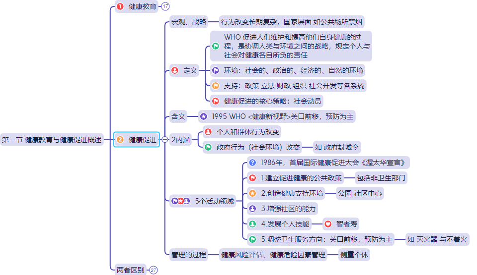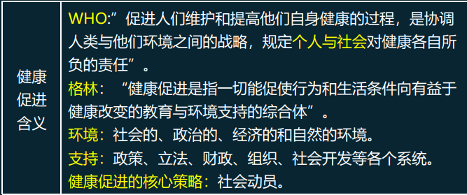 健康促进:WHO 促进人们维护和提高他们自身健康的过程,是协调人类与环境之间的战略,规定个人与社会对健康各自所负的责任。
