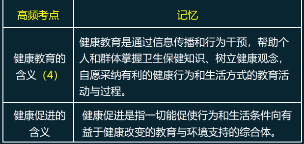 定义:通过 信息传播 和行为干预,帮助个体和群体,自愿采纳有利的健康行为和生活方式的教育活动过程