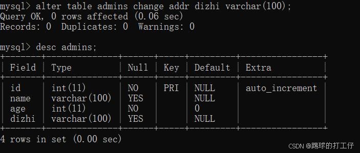 alter table admins change addr dizhi varchar(100);