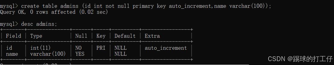 如果有一天你设的表字段无法满足你的需求了,如何处理呢?难不成要重新创建么?当然不是的,我们可以对数据表的字段进行增删改查。我们还是创建一个管理员表admins,只有两个字段id和name;如下: