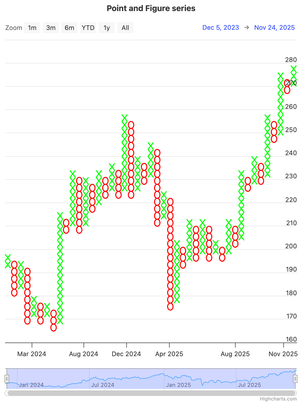 点数与图形系列仅接受[x, close]或{x, close}格式的数据,然后在内部计算为[{ x, [y], marker }]组,每个数组元素具有唯一的x值,从而形成上涨和下跌趋势的柱状。之后,这些组被解析为Highcharts的数据格式[{ x, y, marker }],对于每个组列中的y值,都会创建一个新点,以在点数与图形列中生成单独的点。