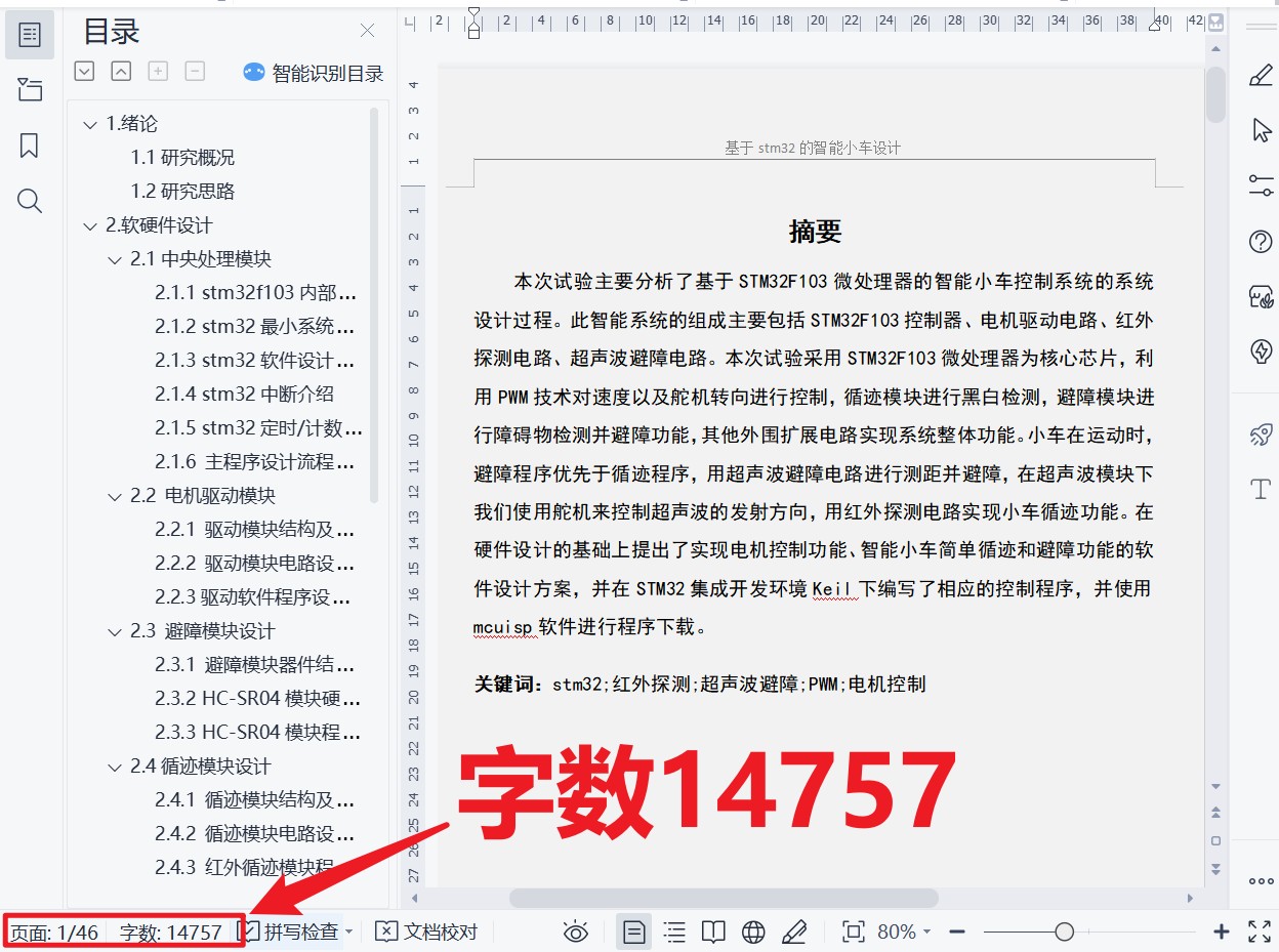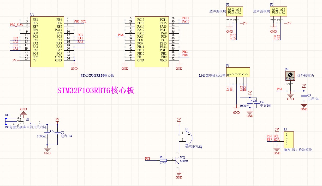 1.以STM32F103RBT6为主控芯片,实现对小车的控制,使小车能够做出前进、后退、左转、右转等基本行驶动作,通过红外遥控控制小车工作模式的转换(自由行走避障模式、跟随模式);