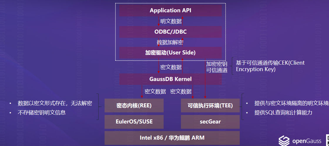 该图展示了 openGauss 在加密驱动层、数据库内核层、可信执行环境三层结构下的数据流动路径: