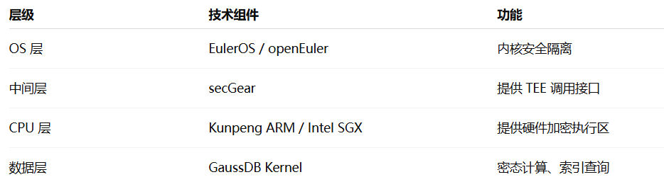 openGauss 的全密态能力与 secGear + Kunpeng + EulerOS 深度集成,形成"软硬一体化可信执行环境":