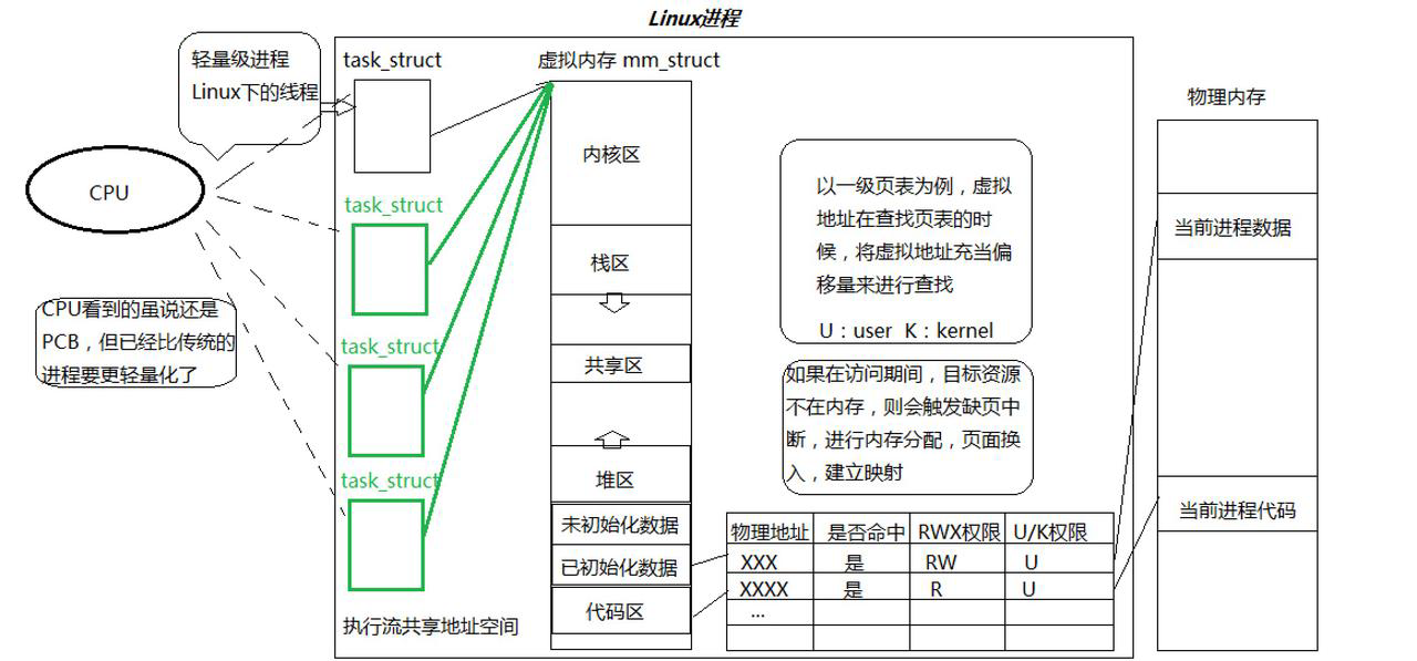 • 透过进程虚拟地址空间,可以看到进程的大部分资源,将进程资源合理分配给每个执行流,就形成了线程执行流