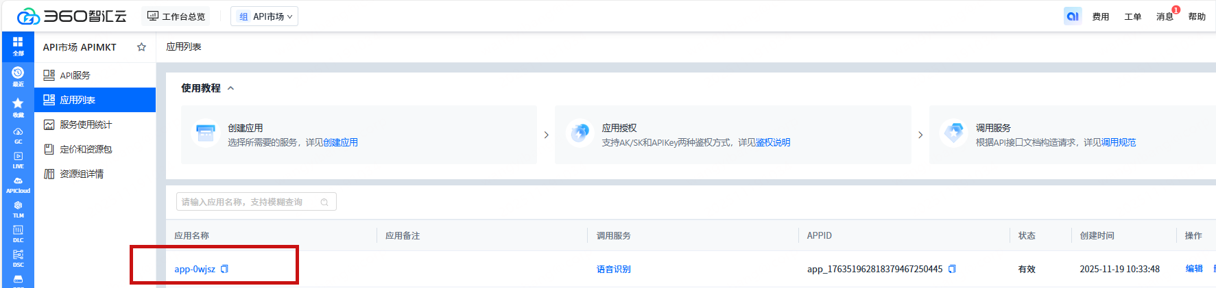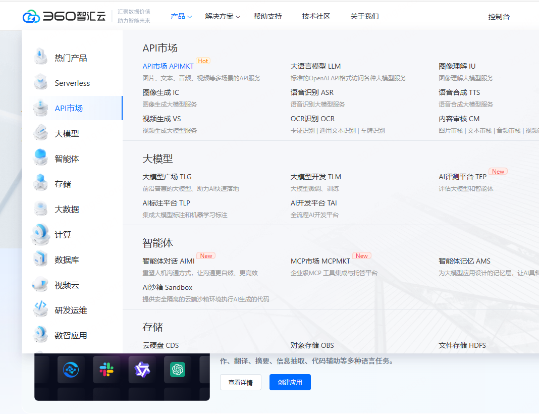 登陆智汇云官网 https://zyun.360.cn/,点击产品 -> API市场 -> API市场 APIMKT :