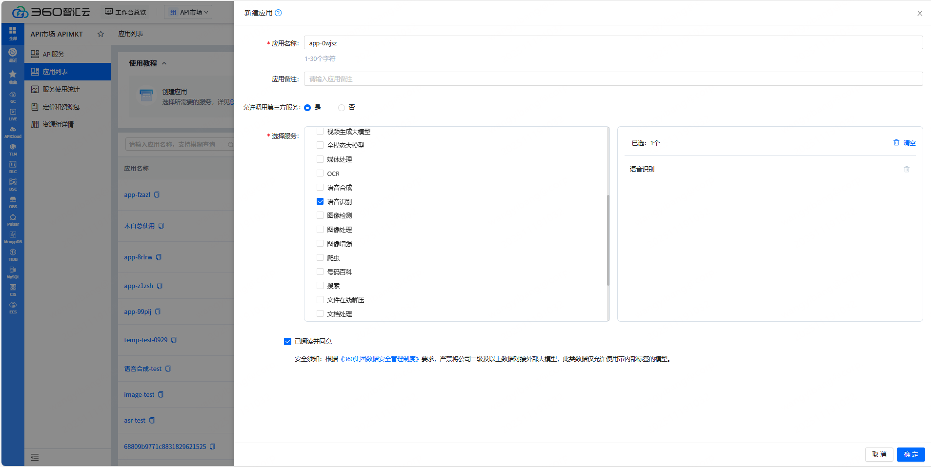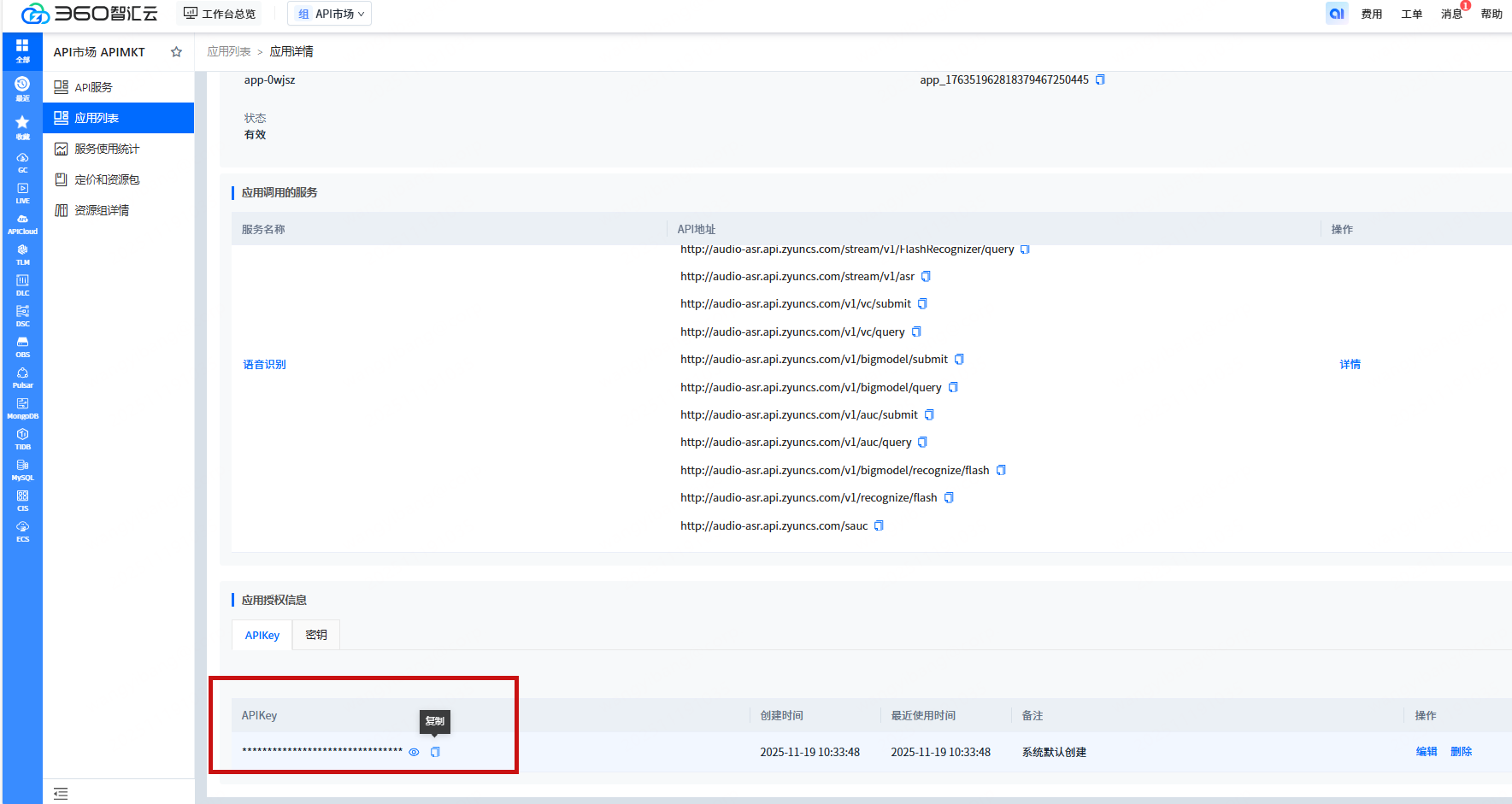 在语音识别详情页点击创建应用