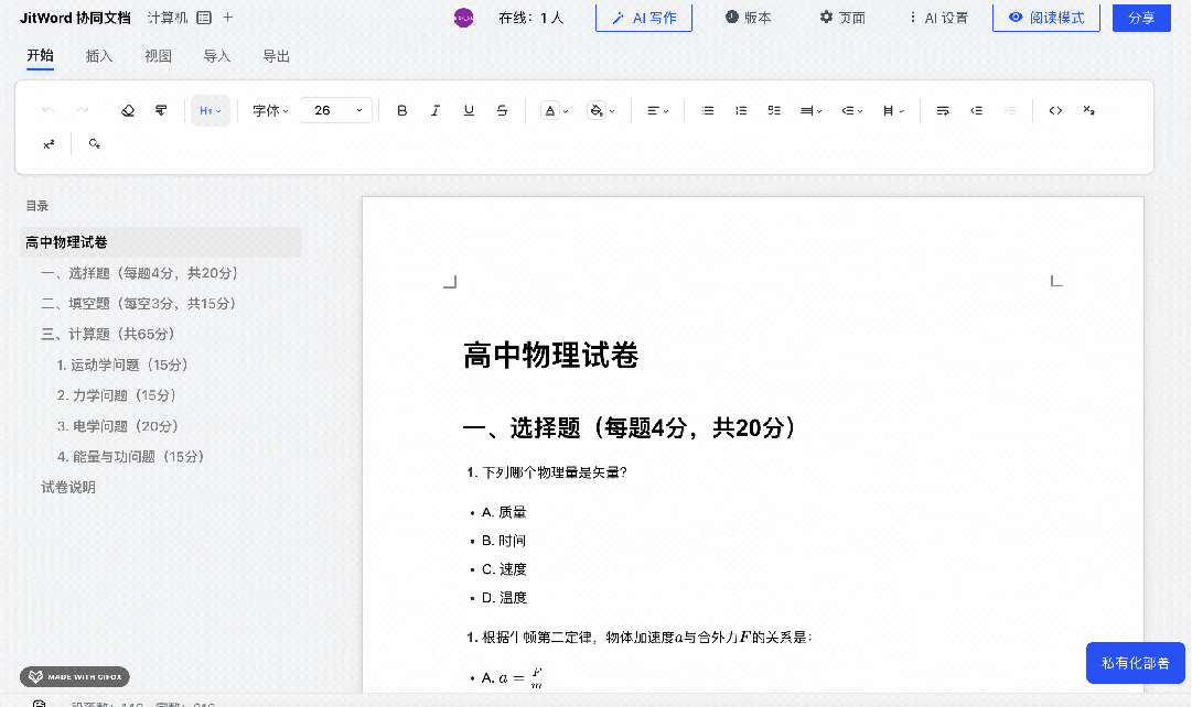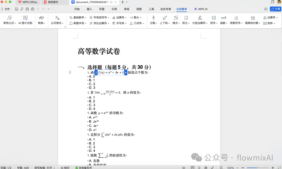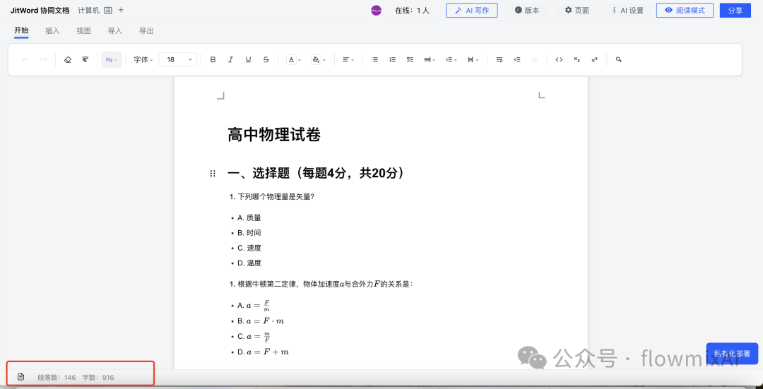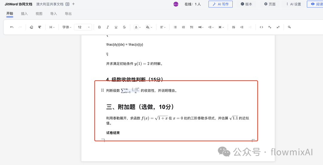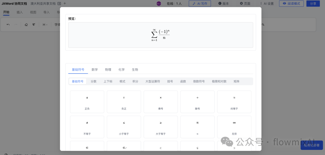 我们公式编辑器涵盖了数学,物理,化学等多种行业的公式编辑,同时支持AI生成带公式的文档,也能直接二次编辑公式: