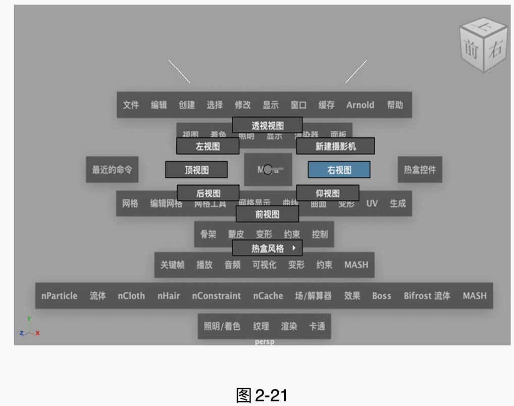 (1)启动中文版Maya 2024软件,按住空格键,在Maya按钮上按住鼠标右键,在弹出的命令菜单中执行"前视图"命令,即可将当前视图切换至"前视图",如图2-21所示。