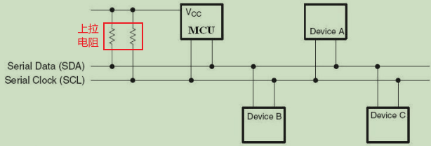 ④总线通过上拉电阻接到电源。当 I2C 设备空闲时,会输出高阻态,而当所有设备都空闲,都输出高阻态时,由上拉电阻把总线拉成高电平