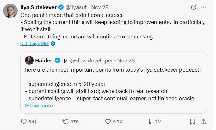 然而,Ilya Sutskever 本人认为这一解读未能准确传达他的本意。为此,在2025年11月28日,他专门发布推文,进行了两点至关重要的澄清: