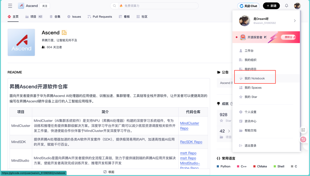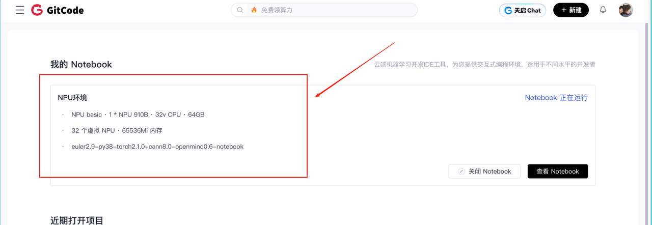 首先,在 GitCode 首页中进入个人控制台,点击上方的 "Notebook 工作区" ,进入你的云端开发环境管理页面。