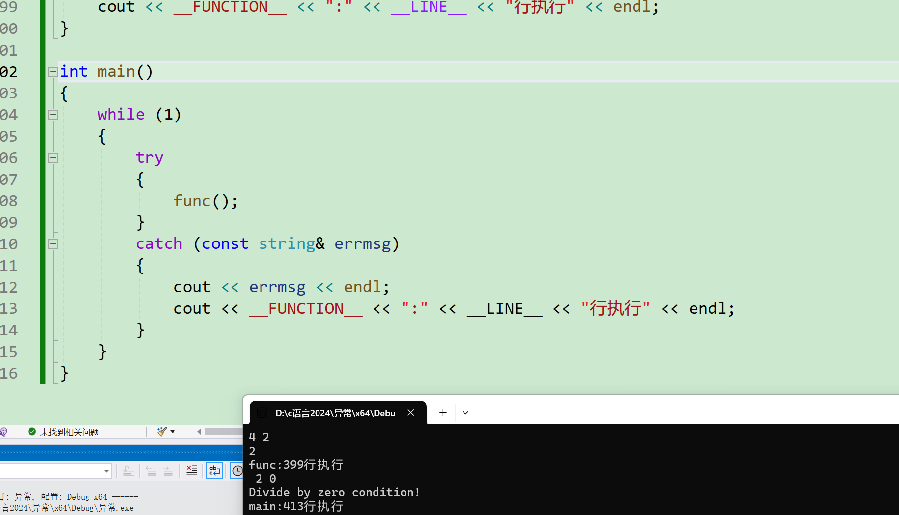 main的try块外有catch(const string&),类型完全匹配 ,异常在此处被捕获,打印"Divide by zero condition!"。 -