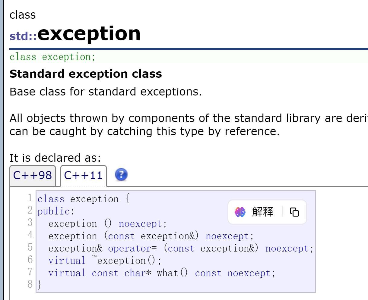 - C++98的方式这种方式过于复杂,实践中并不好用,C++11中进行了简化,函数参数列表后面加noexcept表示不会抛出异常,啥都不加表示可能会抛出异常。