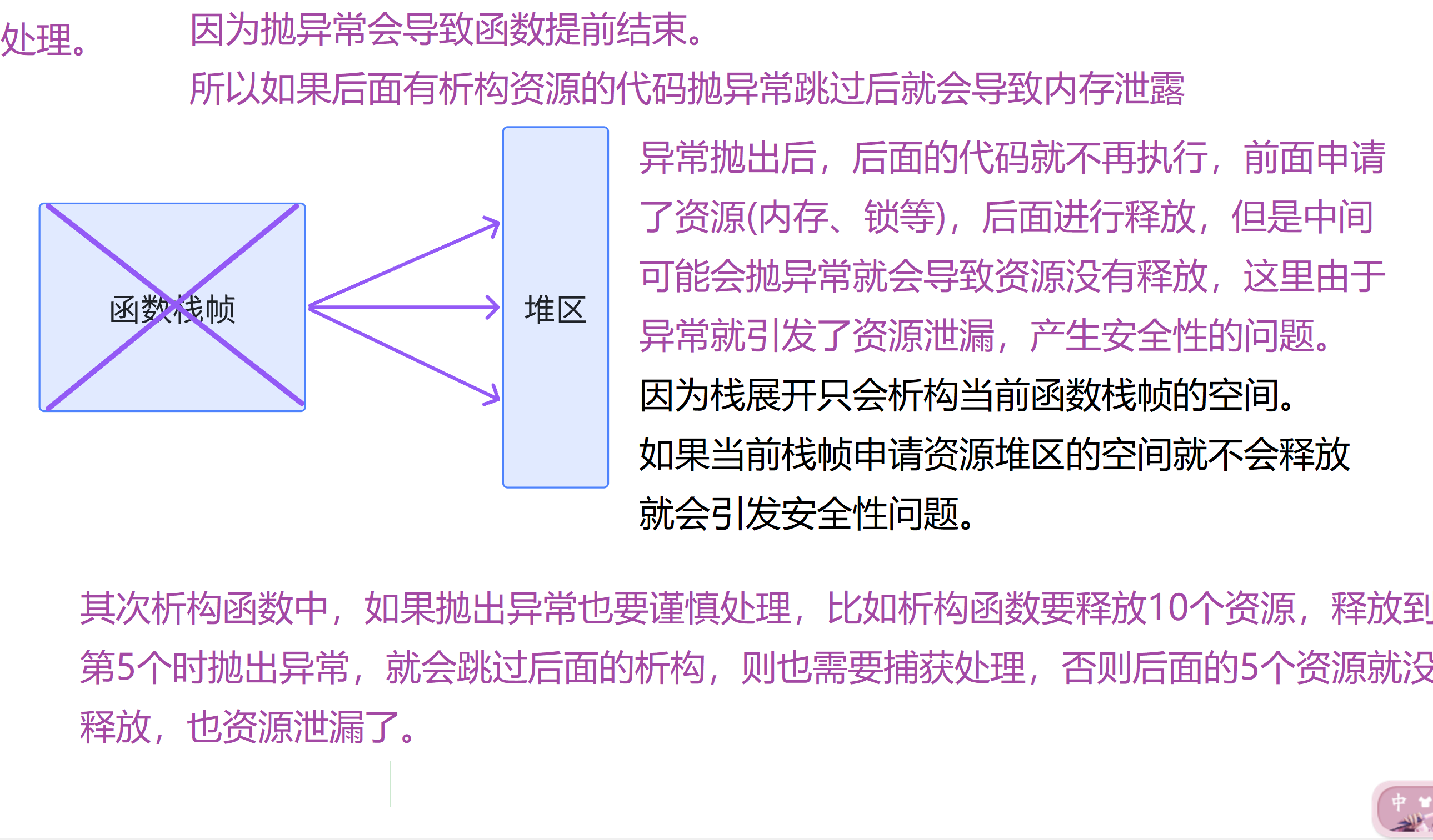 - 异常抛出后,后面的代码就不再执行,前面申请了资源(内存、锁等),后面进行释放,但是中间可能会抛异常就会导致资源没有释放,这里由于异常就引发了资源泄漏,产生安全性的问题。中间我们需要捕获异常,释放资源后面再重新抛出,当然后面智能指针章节讲的RAII方式解决这种问题是更好的。
