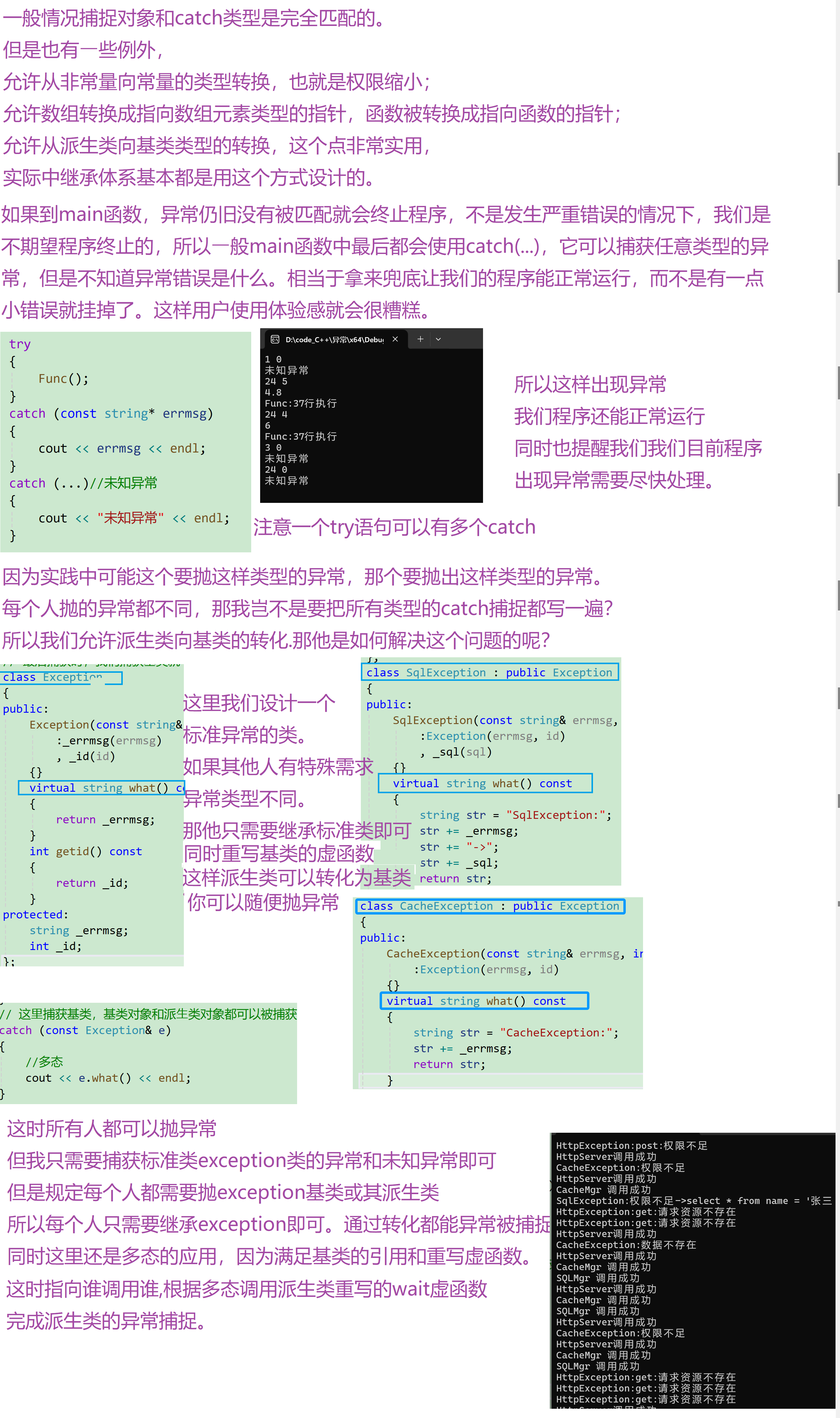 cpp#include<thread> #include<iostream> using namespace std; // ⼀般⼤型项⽬程序才会使⽤异常,下⾯我们模拟设计⼀个服务的⼏个模块 // 每个模块的继承都是Exception的派⽣类,每个模块可以添加⾃⼰的数据 // 最后捕获时,我们捕获基类就可以 class Exception { public: Exception(const string& errmsg, int id) :_errmsg(errmsg) , _id(id) {} virtual string what() const { return _errmsg; } int getid() const { return _id; } protected: string _errmsg; int _id; }; class SqlException : public Exception { public: SqlException(const string& errmsg, int id, const string& sql) :Exception(errmsg, id) , _sql(sql) {} virtual string what() const { string str = "SqlException:"; str += _errmsg; str += "->"; str += _sql; return str; } private: const string _sql; }; class CacheException : public Exception { public: CacheException(const string& errmsg, int id) :Exception(errmsg, id) {} virtual string what() const { string str = "CacheException:"; str += _errmsg; return str; } }; class HttpException : public Exception { public: HttpException(const string& errmsg, int id, const string& type) :Exception(errmsg, id) , _type(type) {} virtual string what() const { string str = "HttpException:"; str += _type; str += ":"; str += _errmsg; return str; } private: const string _type; }; void SQLMgr() { if (rand() % 7 == 0) { throw SqlException("权限不⾜", 100, "select * from name = '张三'"); } else { cout << "SQLMgr 调⽤成功" << endl; } } void CacheMgr() { if (rand() % 5 == 0) { throw CacheException("权限不⾜", 100); } else if (rand() % 6 == 0) { throw CacheException("数据不存在", 101); } else { cout << "CacheMgr 调⽤成功" << endl; } SQLMgr(); } void HttpServer() { if (rand() % 3 == 0) { throw HttpException("请求资源不存在", 100, "get"); } else if (rand() % 4 == 0) { throw HttpException("权限不⾜", 101, "post"); } else { cout << "HttpServer调⽤成功" << endl; CacheMgr(); } } int main() { srand(time(0)); while (1) { this_thread::sleep_for(chrono::seconds(1)); try { HttpServer(); } catch (const Exception& e) // 这⾥捕获基类,基类对象和派⽣类对象都可以被捕获 { cout << e.what() << endl; } catch (...) { cout << "Unkown Exception" << endl; } } return 0; }