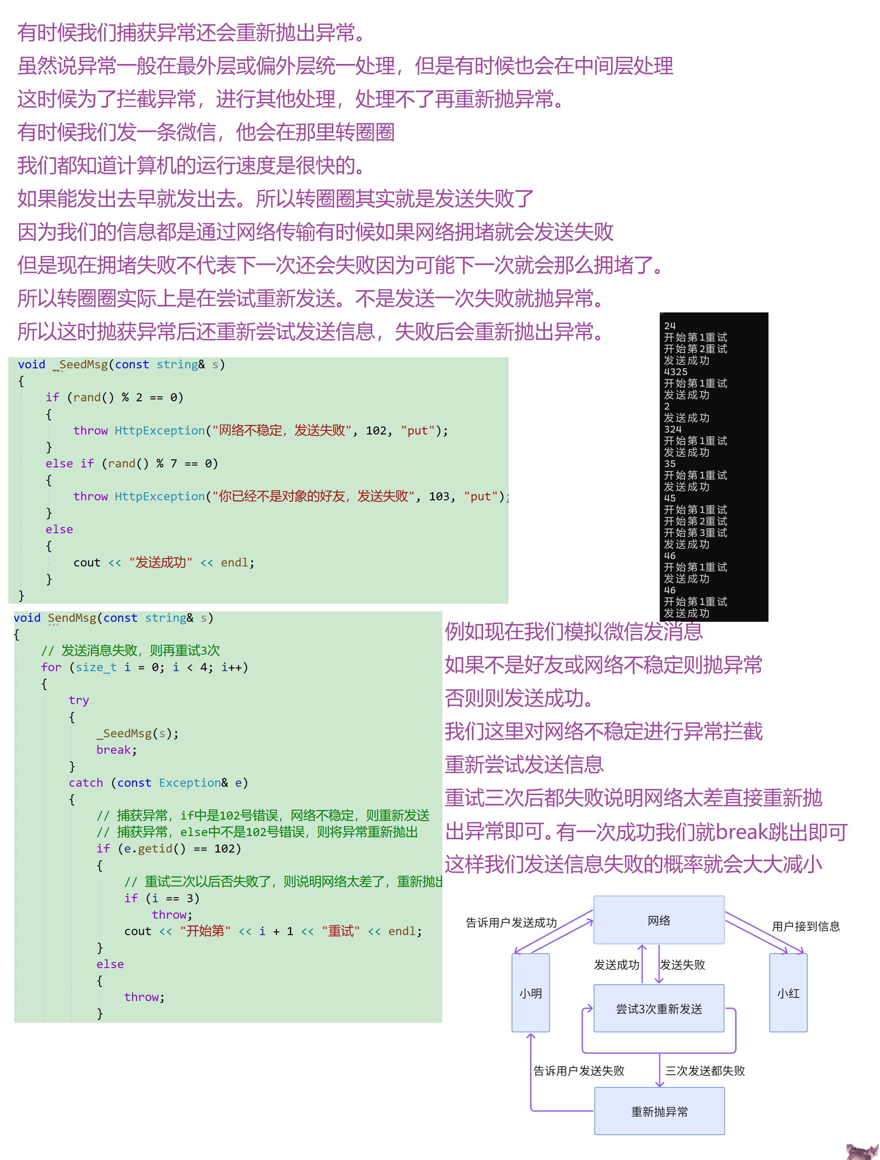 cppvoid test() { std::cout << "before throw\n"; throw 42; std::cout << "after throw (永远看不到)\n"; } int main() { try { test(); } catch(int) { std::cout << "caught 42\n"; } } 输出: before throw caught 42 -