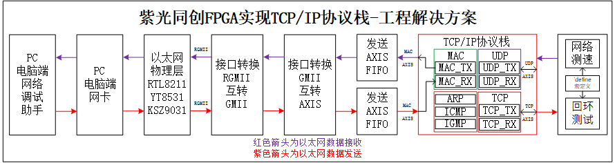 开发板FPGA型号为紫光同创-PG2T70H-6FBB484,电脑端网络调试助手发送测试数据或发起ping操作,然后电脑端操作系统的Socket实现发送数据的以太网帧组包,然后发送给电脑端网卡后通过网线连接到FPGA开发板的RJ45网口;然后差分网络数据进入FPGA开发板板载的RTL8211型号的、工作与延时模式的PHY芯片实现以太网物理层功能,将差分数据转换为并行RGMII接口数据;RGMII网络数据再送入纯verilog实现的RGMII互转GMII模块,实现双沿采集的RGMII数据到单沿采集的GMII数据转换,需要使用紫光的GTP_ISERDES_E2源语;GMII数据再进入纯verilog实现的GMII互转AXI4-Stream模块将GMII接口数据转换为AXI4-Stream流;AXI4-Stream流再进入纯verilog实现的异步AXI4-Stream FIFO模块实现跨时钟域处理;然后AXI4-Stream MAC流数据进入纯VHDL实现的TCP/IP协议栈实现以太网帧解包,解析各种头部信息,并提取输出TCP报文的有效数据段;有效数据再经过回环后回灌到TCP/IP协议栈实现以太网帧组包,即加上各种头部信息和校验;然后数据送入纯verilog实现的GMII数据再进入GMII互转AXI4-Stream模块将AXI4-Stream MAC流数据转换为GMII接口数据;然后GMII数据再送入纯verilog实现的RGMII互转GMII模块,实现单沿采集的GMII数据到双沿采集的RGMII数据转换,需要使用紫光的GTP_OSERDES_E2源语;然后RGMII接口的MAC数据再进入板载PHY芯片实现以太网物理层,输出差分信号,并通过网线发送到电脑端;电脑端操作系统的Socket实现接收数据以太网解包,然后数据给网络调试助手显示;网络调试助手同时显示发送和接收数据,以此观察TCP数据回环的正确性;