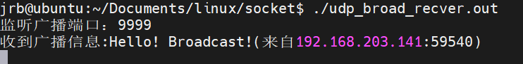 printf("收到广播信息:%s(来自%s:%d)\n", buf, inet_ntoa(sender_addr.sin_addr), ntohs(sender_addr.sin_port));