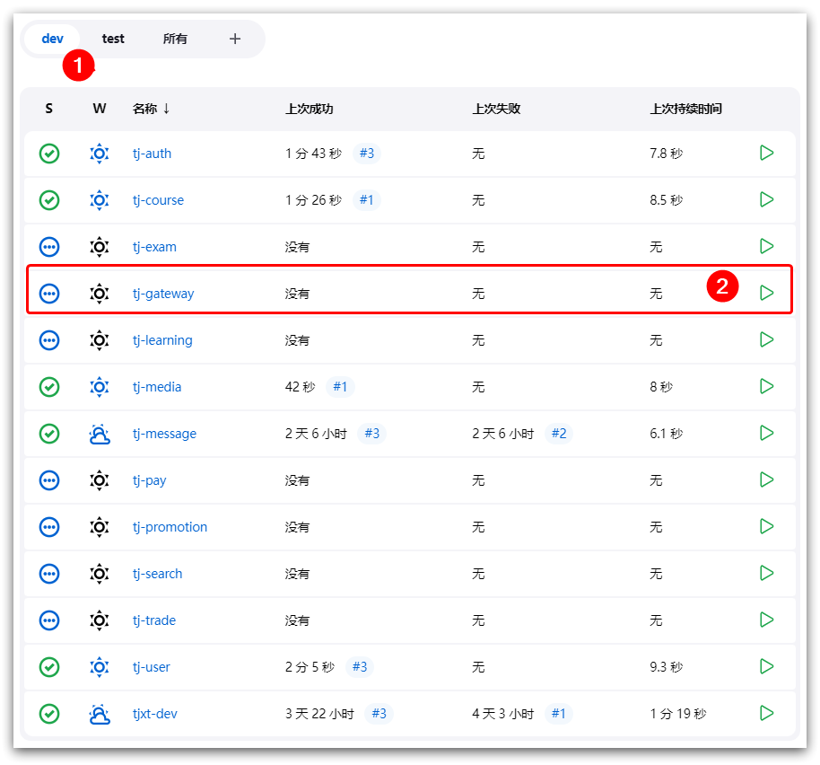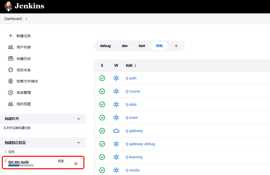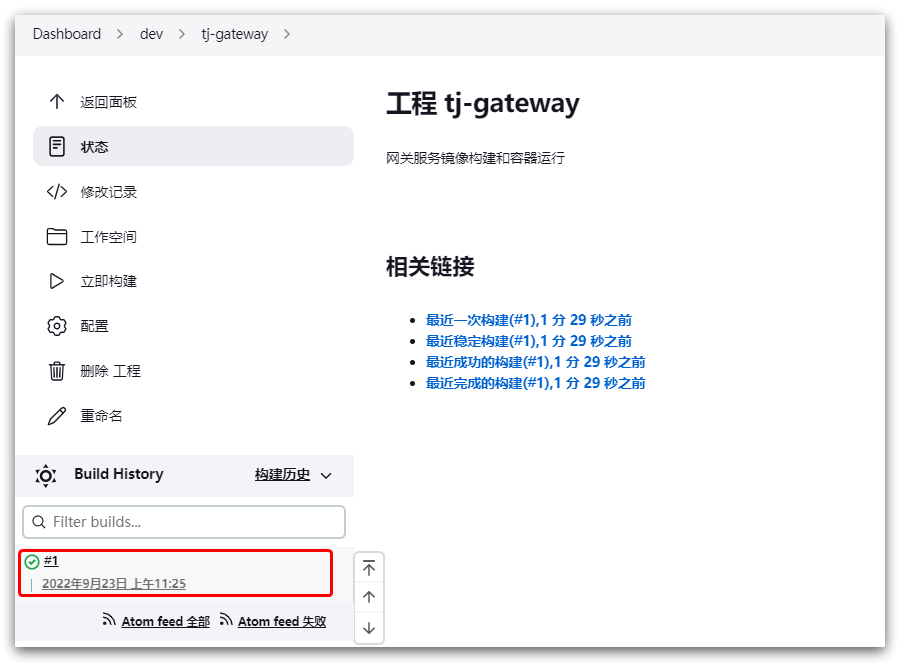 - 完成后,点击对应的微服务名称【例如tj-gateway】,即可进入构建任务的详情页面,在页面左侧可以看到构建历史: