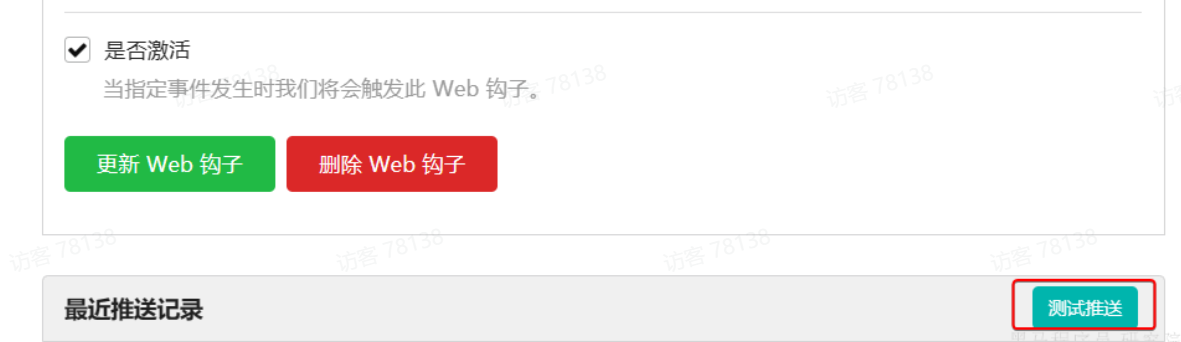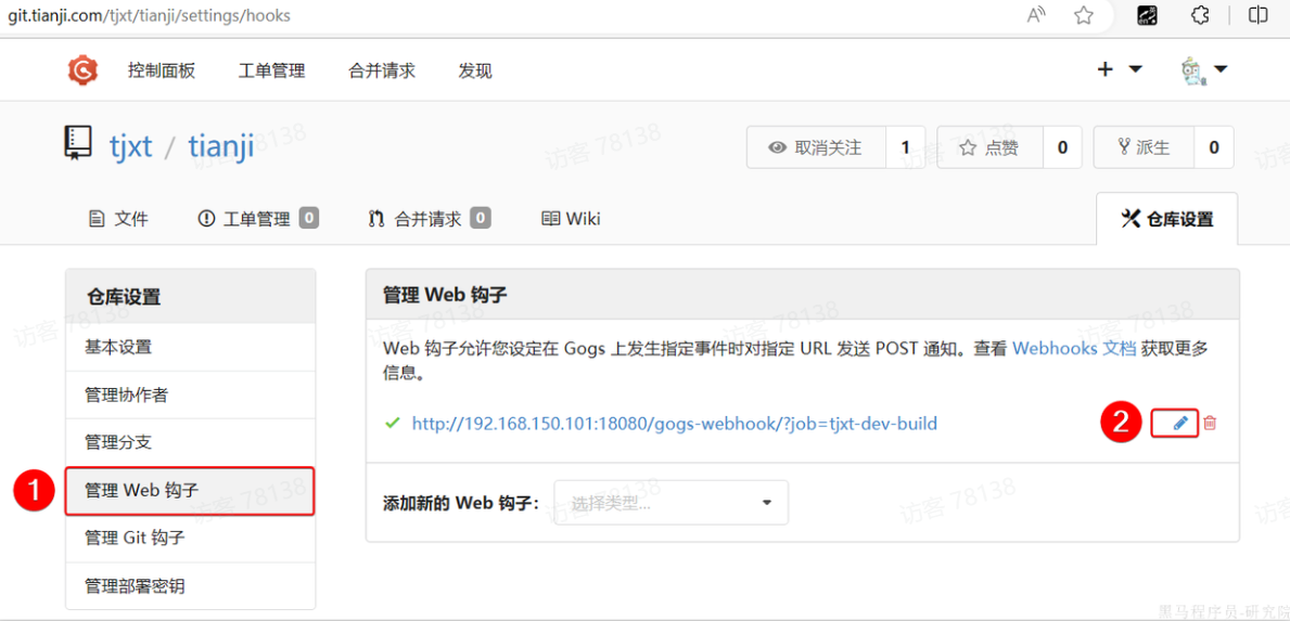 - 然后,点击《管理Web钩子》菜单,进入页面后点击钩子后面的修改按钮: