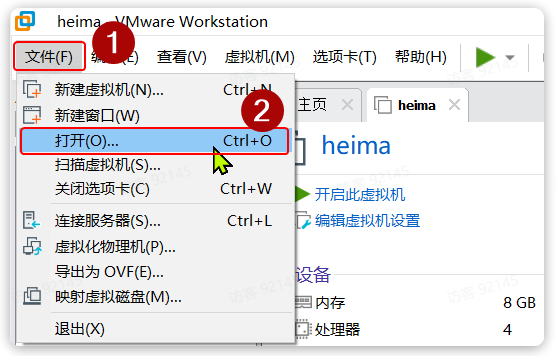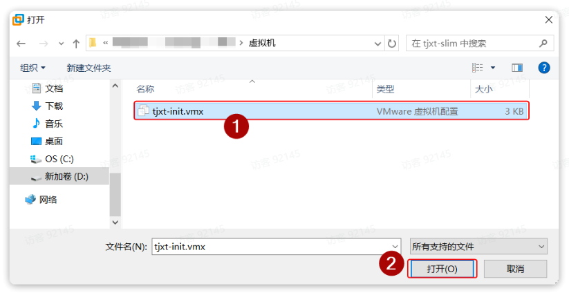 找到提供的虚拟机文件夹,进入文件夹后,选中*.vmx文件,然后点击打开: