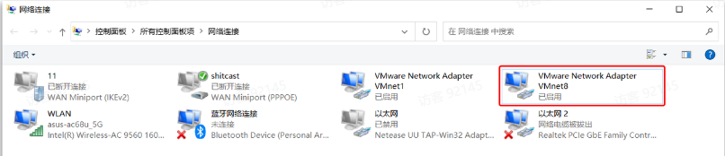 点击确定后,等待一段时间,VMware会重置你的虚拟网卡。完成后,可以在windows的网络控制面板看到: