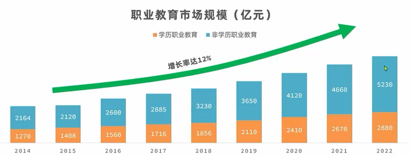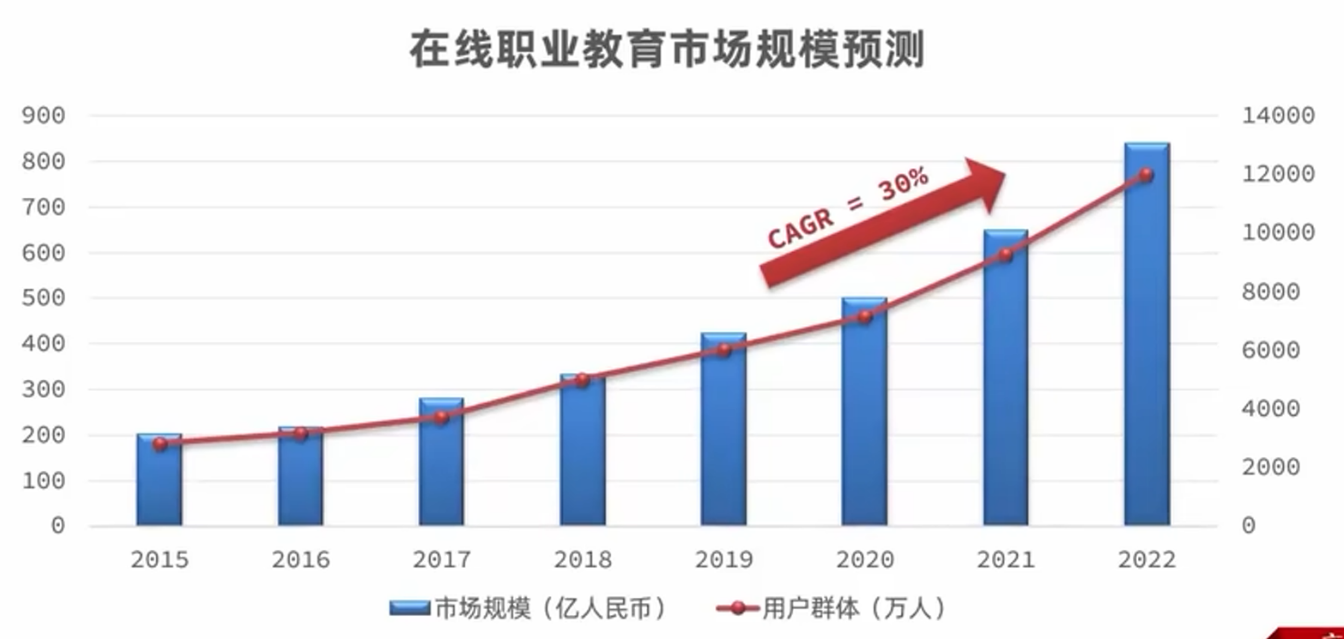 随着互联网发展,传统行业也逐渐网络化发展。再加上疫情的影响,很多职业技能培训企业都开始发展在线教育。相比于传统线下培训,在线教育有成本更低,学习时间碎片化,教育资源能充分利用。因此,在线教育市场规模不断增长,前景巨大。