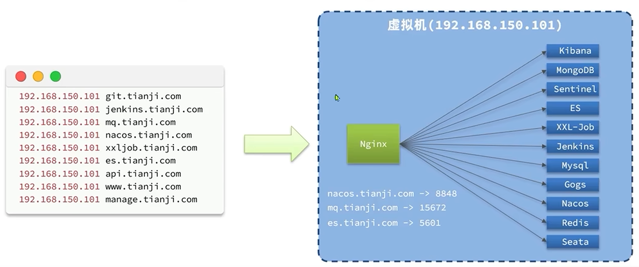 当我们访问上述域名时,请求实际是发送到了虚拟机,而虚拟机中的Nginx会对这些域名做反向代理,这样我们就能请求到对应的组件了: