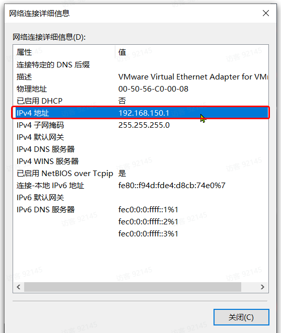 在详细信息中,查看IPv4地址是否是 192.168.150.1: