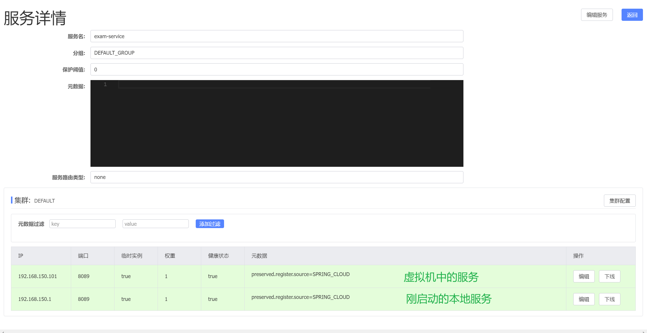 可以在本地启动ExamApplication,然后我们去Nacos控制台查看exam-service,可以看到有两个实例,分别是虚拟机IP和宿主机IP: