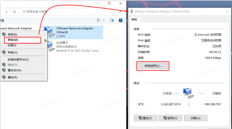 选中该网卡,右键点击,在菜单中选择状态,并在弹出的状态窗口中选择详细信息: