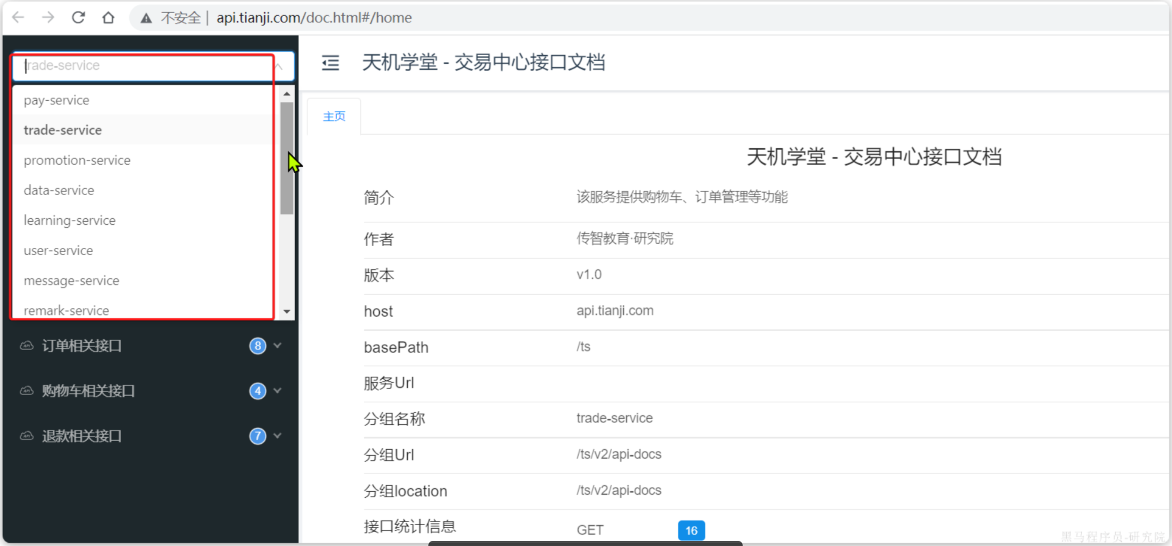 - 如果想要知道微服务具备哪些API接口,可以访问网关中的swagger页面,路径如下:http://api.tianji.com/doc.html