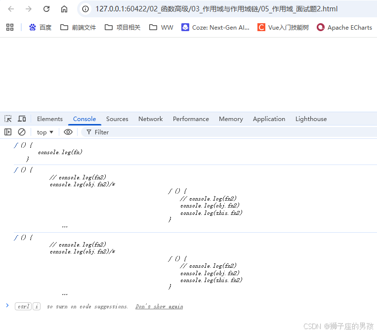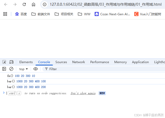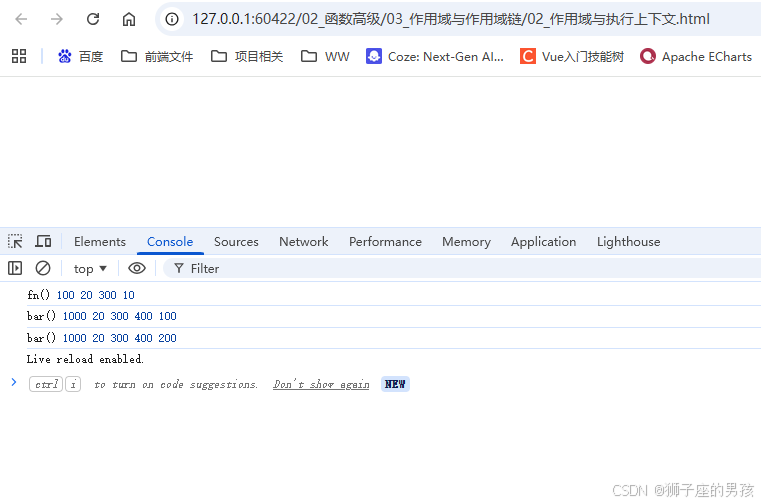 4(*)、小结:作用域在执行上下文之前创建,作用域是静态的(即:函数定义就创建)而上下文是动态的(即:函数调用才创建);