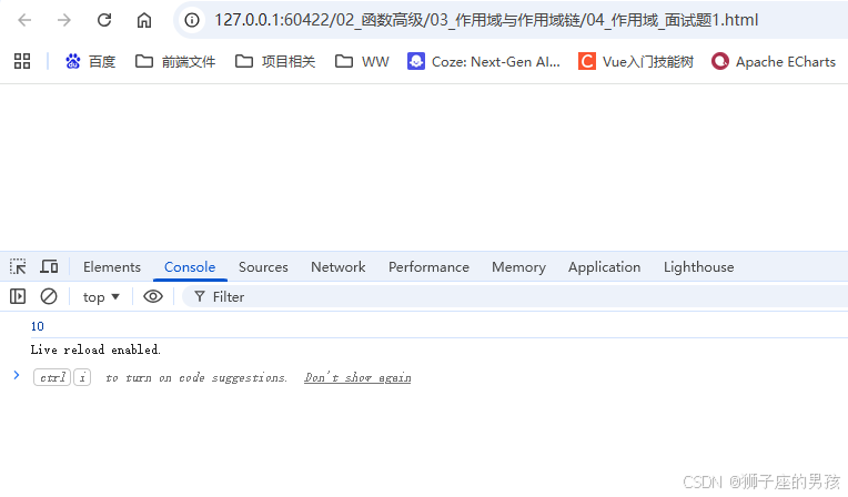 // 因此执行 console.log(x) 代码时,会在本函数中查找 x 的值,没找到就去全局作用域下找,而非调用 fn 函数的 show 函数中找,因此输出是 10;