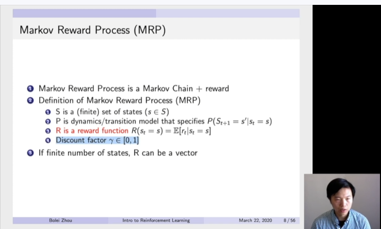 这里我们再来看一看马尔可夫奖励过程。马尔可夫奖励过程是马尔科夫链再加上了一个奖励函数。我们在定义马尔可夫奖励过程之中,这个转移矩阵跟它的这个状态都是跟马尔科夫链一样的。这里多了一个是奖励函数,奖励函数是一个期望,他说当到达某一个状态的时候,可以获得多大的奖励。然后这里另外定义了一个discount factor。伽马我们接下来会进一步解释这个折扣量。