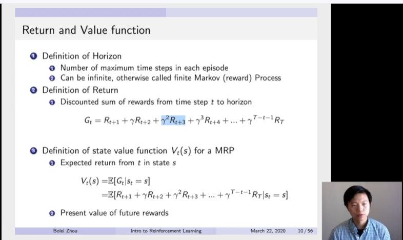 return :说的是我们把奖励进行折扣,然后获得的这个收益。这个return的定义你可以看到它是从你后面得到的return,然后逐步叠加起来。然后这里有一个叠加系数,就每一个越往后的得到的奖励,我们折扣的越多,就说明我们其实更希望得到现有的奖励。未来我们的这个奖励的话就要把它打折扣。
